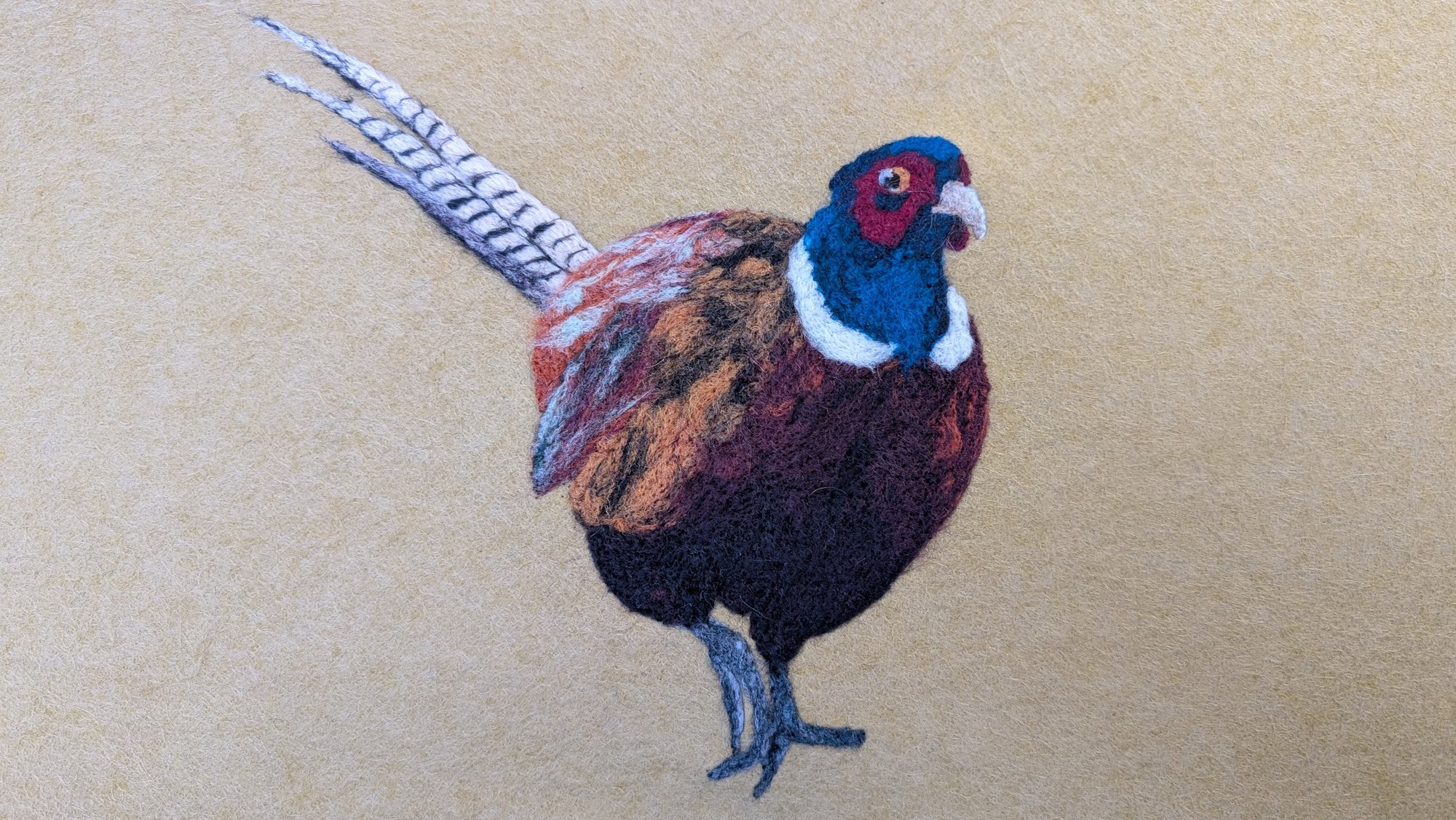30cm lampshade featuring a needle felt Pheasant on a mustard green felt background.